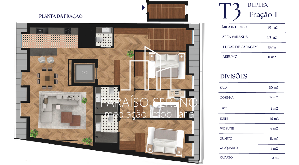 Apartamento T3 Duplex, distribuído pelos pisos 4 e 5, localiza-se numa zona central e valorizada do Porto, destacando-se pela excelente luminosidade natural, conforto e qualidade dos acabamentos. Com 149 m² de área interior, foi concebido para proporcionar uma vivência moderna e funcional. Dispõe de uma sala ampla e acolhedora, cozinha totalmente equipada com eletrodomésticos encastrados e acabamentos de qualidade, uma suíte e dois quartos espaçosos, todos com boas soluções de arrumação. As casas de banho apresentam um design contemporâneo e materiais de referência. O imóvel está equipado com ar condicionado centralizado, bomba de calor, caixilharia com vidro duplo e corte térmico, iluminação LED, porta de segurança e vídeo-porteiro, garantindo conforto, eficiência e segurança. Inclui ainda lugar de garagem e arrumo privativo. Inserido em edifício moderno com jardins comuns, beneficia de uma localização privilegiada, próximo de transportes públicos, comércio, serviços, escolas e com rápidos acessos às principais vias da cidade e às praias. Uma excelente oportunidade para habitação própria ou investimento, aliando qualidade de vida ao dinamismo urbano do Porto. O empreendimento dispõe de apartamentos com diferentes tipologias, incluindo: T2+1 com jardim privativo T2+1 com varanda T3 Duplex com jardim privativo, localizados nos pisos 1 e 2 Início de obra: final de 2024 | Conclusão prevista: 2.º semestre de 2026. Para mais informações ou marcação de visita, não hesite em contactar-nos, sem qualquer compromisso! Na compra de um imóvel a Paraíso Sereno oferece-lhe um voucher para uma semana de férias no Algarve!