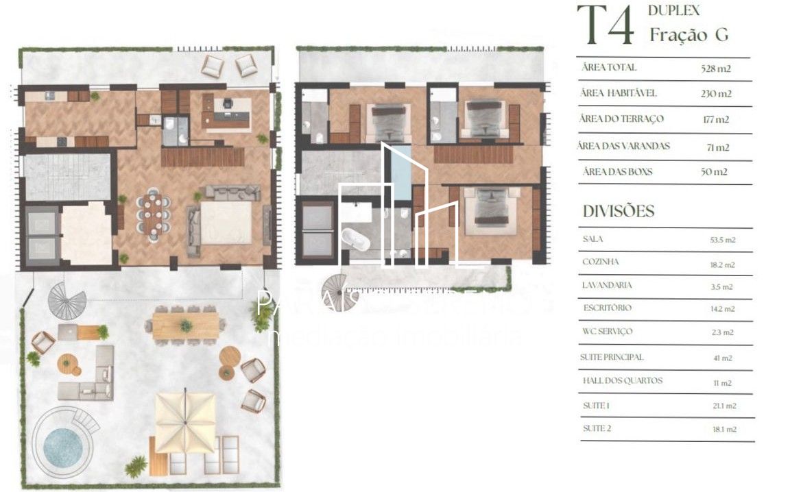 Inserido no condomínio Paulo Dias Novais 45, um empreendimento residencial de arquitetura contemporânea, em construção num lote de 800 m², junto à Avenida da Boavista, no quarteirão das ruas Correia de Sá e Paulo Dias Novais, a apenas 200 metros da Avenida Marechal Gomes da Costa. Este apartamento T4 Duplex – Fração G, localizado nos pisos 4 e 5, dispõe de uma impressionante área total de 528 m², com 230 m² de área habitável, 71 m² de varandas, 50 m² de terraço e box de estacionamento. No piso principal encontra-se uma ampla sala com, cozinha independente, escritório, WC de serviço e lavandaria. O piso superior é composto por 3 suites, incluindo uma suite principal com, garantindo total conforto e privacidade. Os acabamentos refletem um padrão elevado de qualidade, com soalho maciço em espinha, mármore Estremoz e Ruivina nas zonas húmidas, cozinha totalmente equipada com eletrodomésticos Bosch ou equivalente, ar condicionado centralizado, bomba de calor, caixilharia com vidro duplo e corte térmico, porta de segurança, videoporteiro e iluminação LED. Com orientação nascente/poente, este T4 Duplex foi concebido para quem procura espaço, exclusividade e conforto, numa das zonas mais prestigiadas do Porto, junto ao Parque da Cidade, Foz, Universidade Católica e colégios de referência. A excelente rede de transportes públicos, com destaque para o Metrobus, assegura acessos rápidos à Rotunda da Boavista, centro da cidade e praias. O empreendimento dispõe de apartamentos com diferentes tipologias, incluindo: T3 com jardim privativo ao nível do piso térreo T3 com varanda, localizados nos pisos 2 e 3 T4 com terraço e varanda nos pisos 4/5 Início de obra: final de 2024 | Conclusão prevista: 2.º semestre de 2026. Para mais informações ou marcação de visita, não hesite em contactar-nos, sem qualquer compromisso! Na compra de um imóvel a Paraíso Sereno oferece-lhe um voucher para uma semana de férias no Algarve!